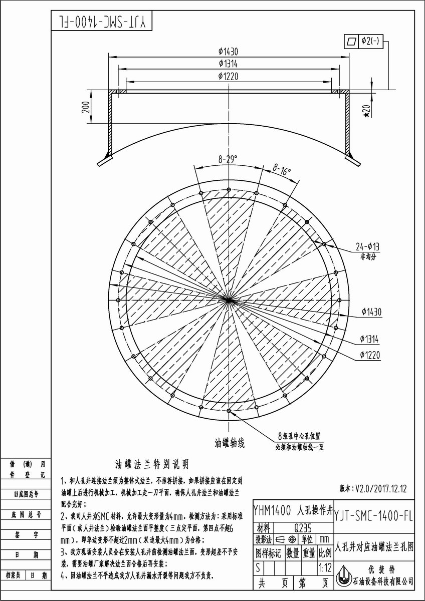 2、防止安裝角度偏移,采用非均分結(jié)構(gòu),錯(cuò)一個(gè)孔角度,人孔井是安裝不上的,只有人孔井安裝管線的面朝著油罐軸線才能安裝對準(zhǔn)安裝孔,才能穿螺栓緊固;